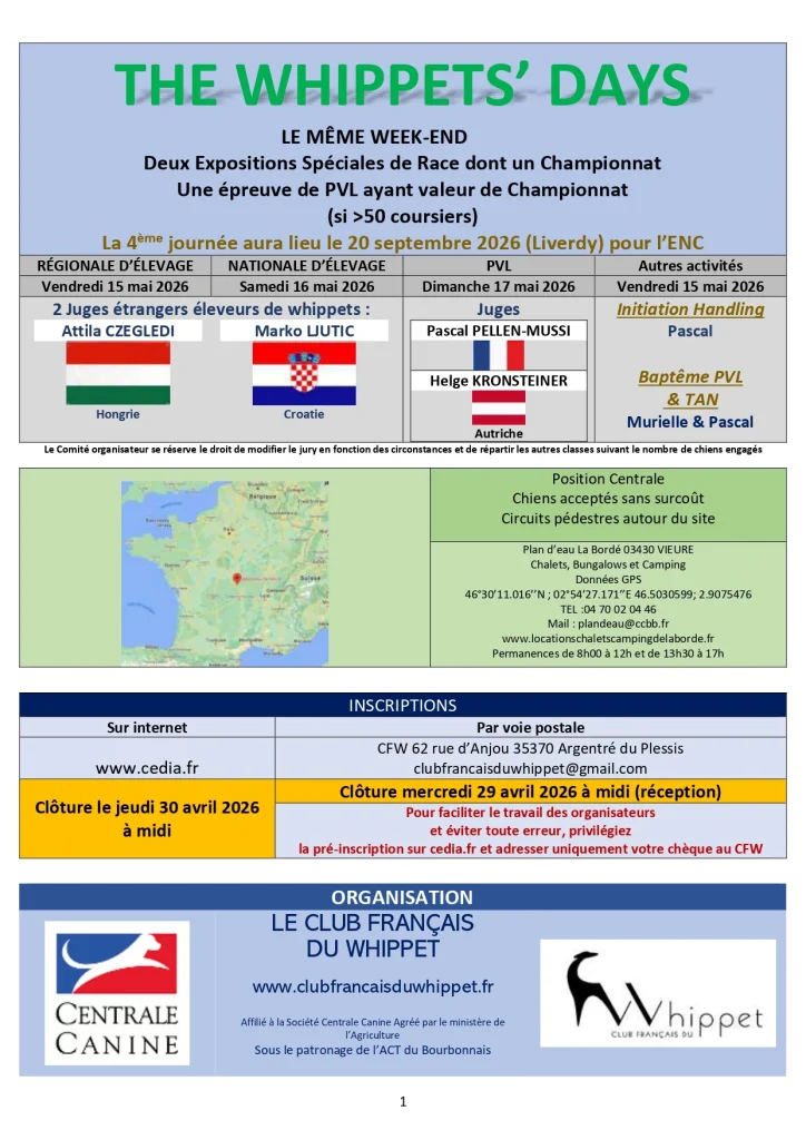 Le club de race « Club Français du Whippet » est une association qui a pour objet de favoriser pour la race Whippet le respect du « standard » (caractéristiques morphologiques et comportementales) en vue d’améliorer la race, d’en encourager l’élevage, de contribuer à sa promotion, de développer son utilisation.